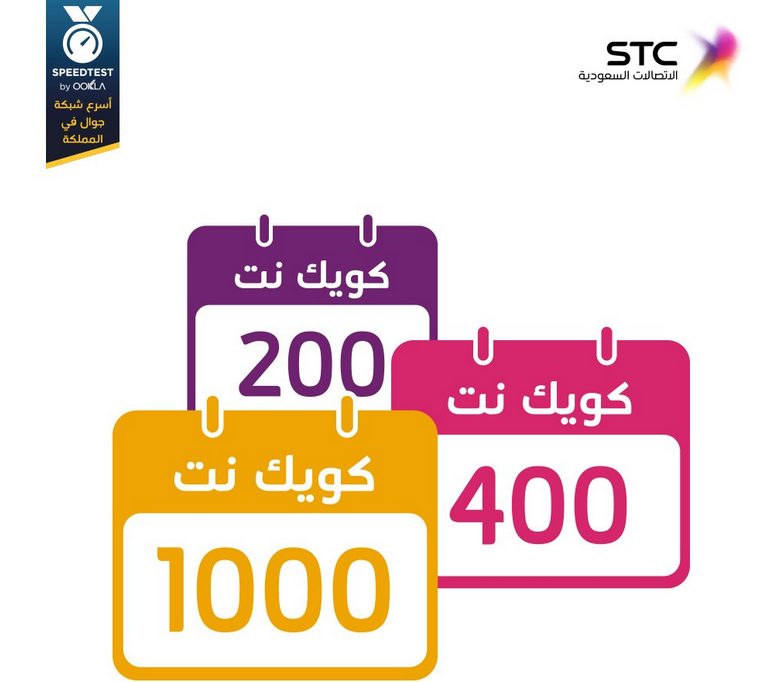• بطاقة كويك نت بسعر 402.50 ريال سعودي: وتمنح العميل 100 جيجا بايت صالحة للاستخدام لمدة ثلاثة شهور.